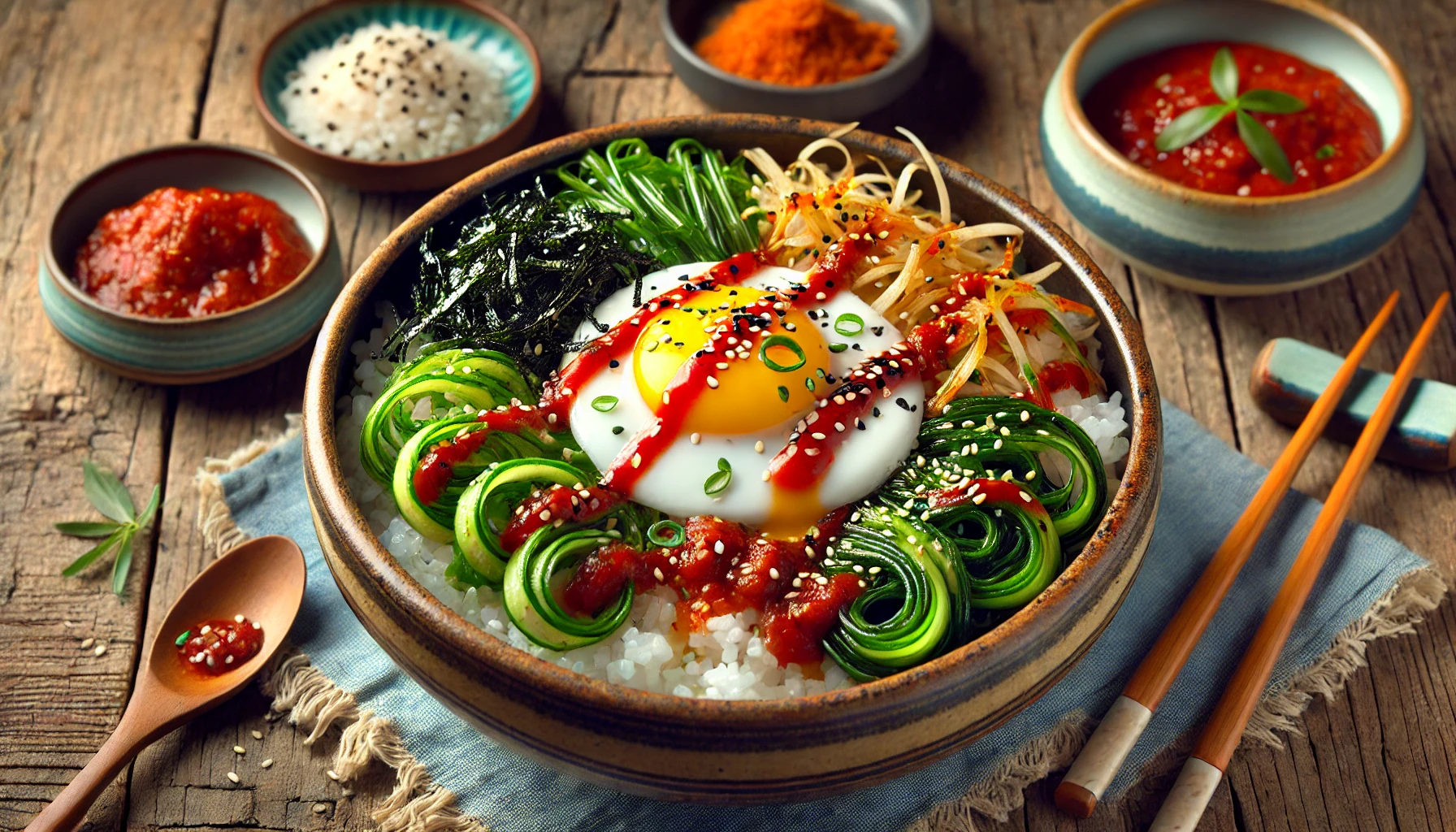 - 비빔밥 준비: 그릇에 밥을 담고 두릅, 고추장, 참기름, 달걀 프라이를 올립니다.