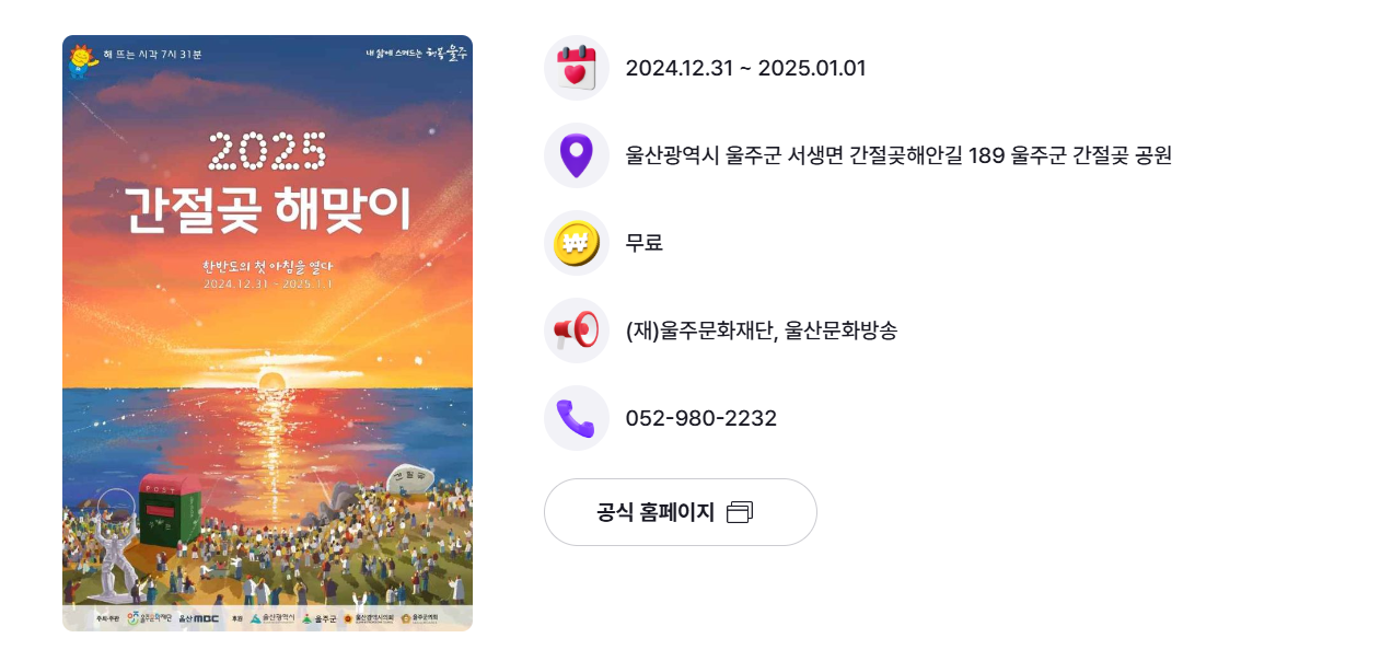 해맞이 축제는 단순히 일출을 감상하는 것을 넘어, 새로운 시작을 다짐하며 사람들과 소통할 수 있는 특별한 순간입니다. 해맞이 축제와 함께 주변 관광지도 즐기며 알찬 하루를 보내 보세요. 따뜻한 방한용품을 꼭 챙기셔서 추위 속에서도 즐겁고 안전한 시간을 보내시길 바랍니다.2025년 새해, 모든 소망이 이루어지기를 바랍니다!