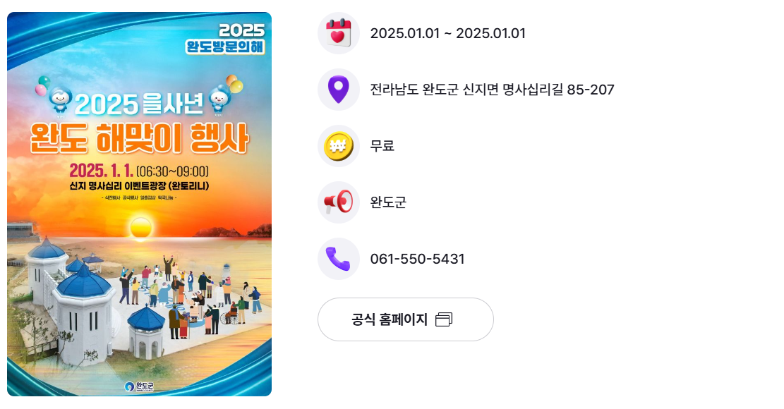 2025년 완도 방문의 해를 맞아 이를 기념하고 해양치유를 홍보하기 위한 해맞이 행사로 새해 풍물 길놀이 행사와 새해 희망콘서트 등 다양한 볼거리를 제공하고 희망 신년 타고, 붓글씨 퍼포먼스, 소망지 매달기 등 다양한 퍼포먼스를 선보일 예정이다. 방문객들의 새해 소망과 다짐이 이뤄질 수 있도록 해맞이 행사를 알차게 준비하고 있으며 행사가 끝나고 무료 떡국, 차 나눔, 새해 덕담 등을 진행할 예정이다.