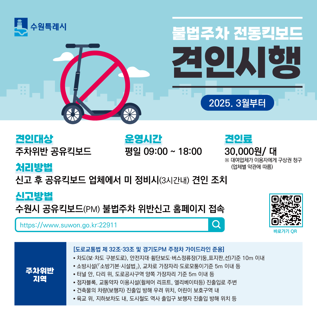 수원특례시는 이러한 문제를 해결하기 위해 2025년 3월부터 불법주차된 공유킥보드를 강력 단속하고,