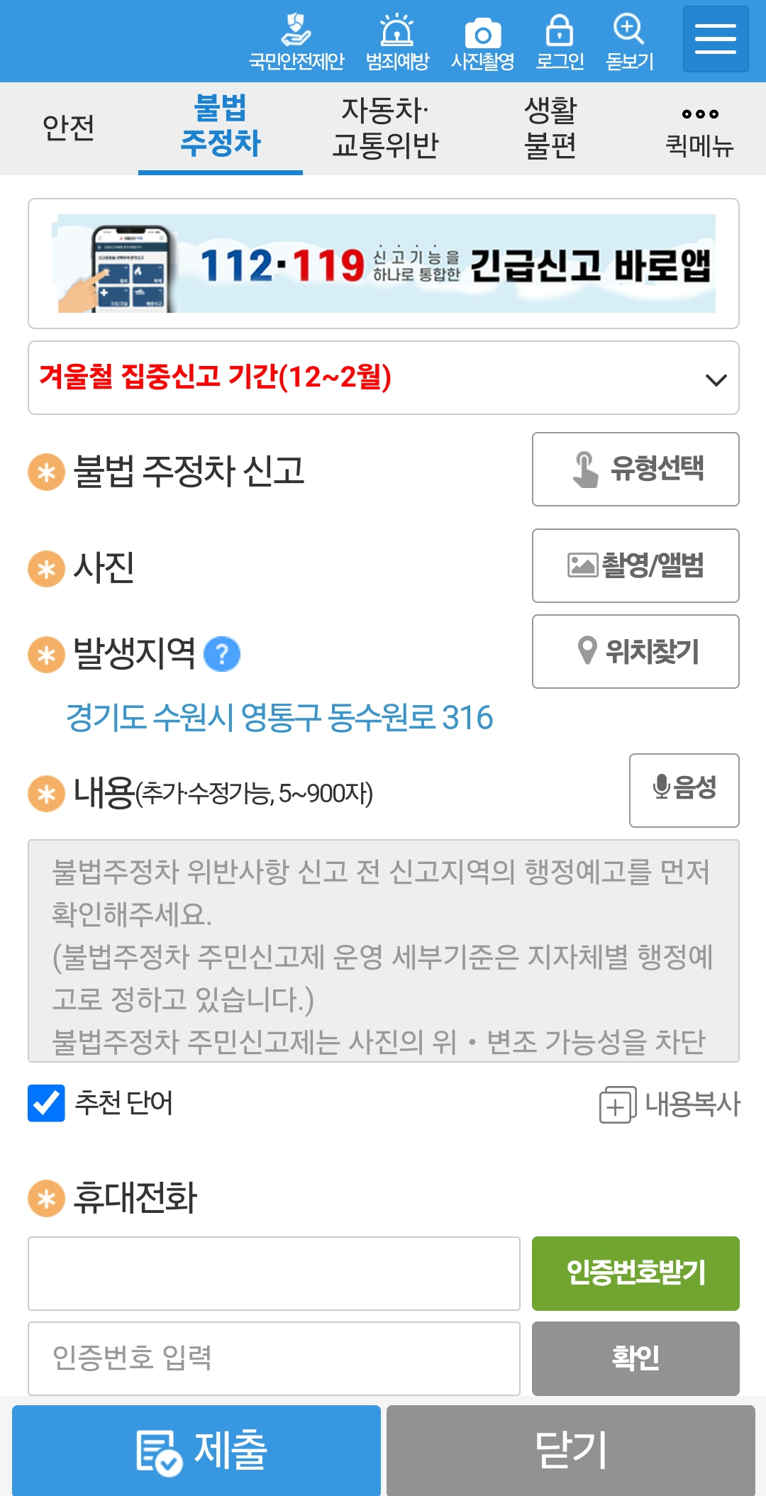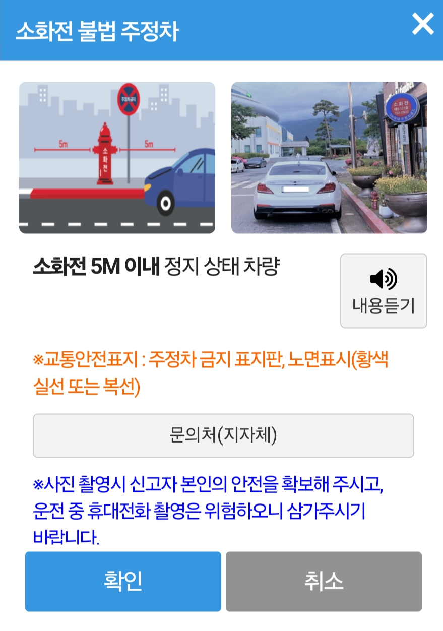 - 불법주정차 유형을 선택하고 간단한 설명을 추가합니다. 예: "소화전 앞 주차로 긴급 차량 통행이 불가합니다."