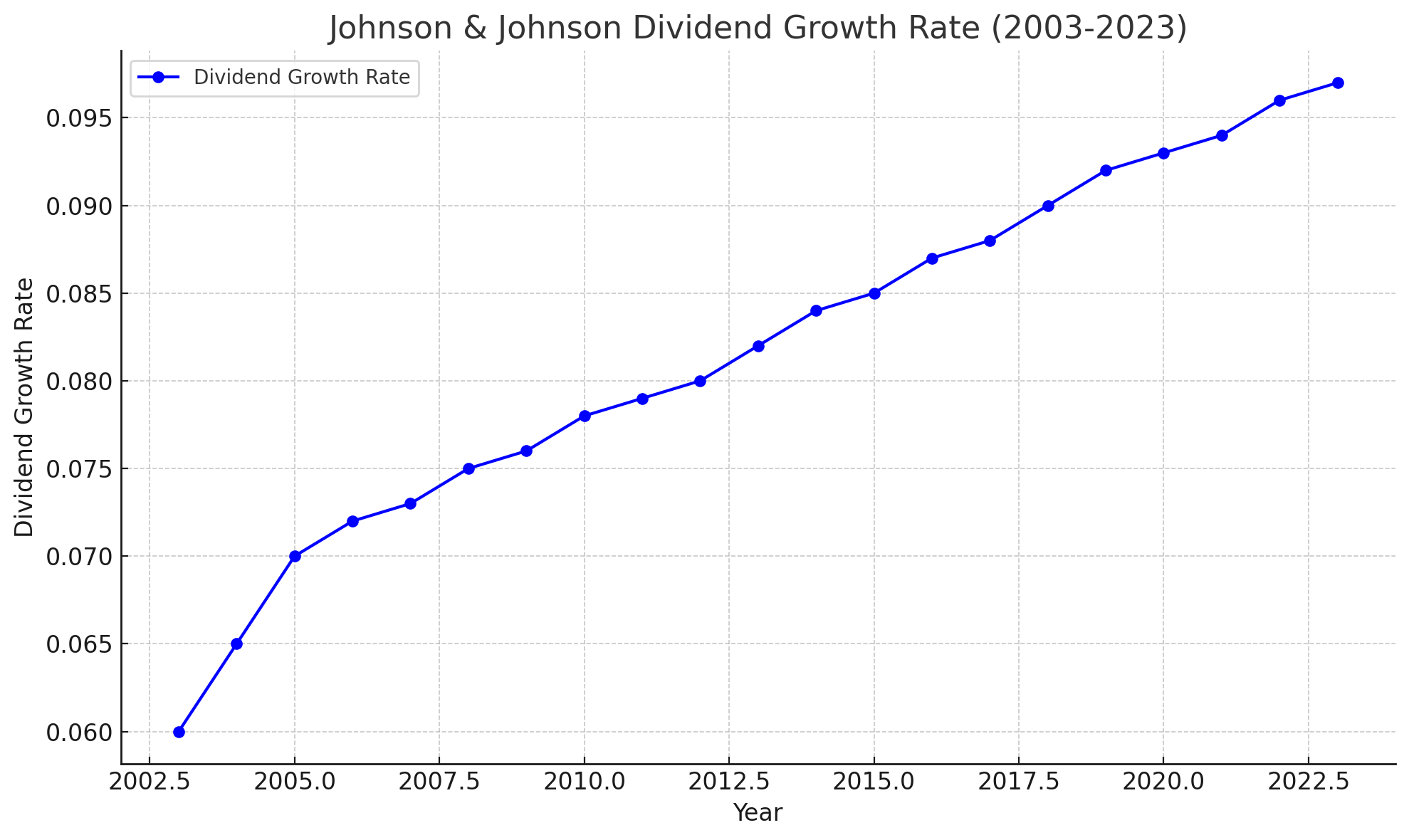 위 그래프는 존슨앤드존슨의 과거 20년 동안의 배당 성장률을 보여줍니다. 이 기간 동안 존슨앤드존슨의 배당은 꾸준히 상승해 왔으며, 연평균 성장률은 6-9% 범위에서 안정적으로 증가한 것을 확인할 수 있습니다. 이러한 배당 성장률은 장기 투자자들에게 매우 유리한 수익률을 제공합니다.